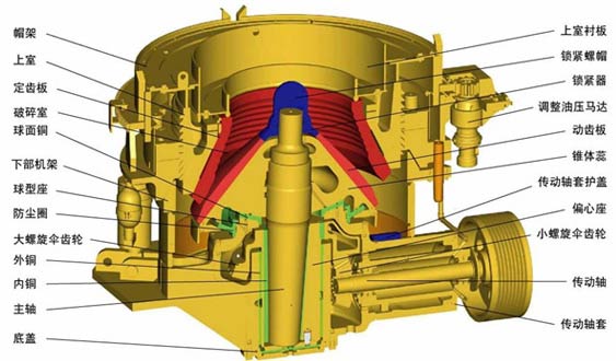 2、機(jī)架:用螺栓固定在基礎(chǔ)上的機(jī)架,把破碎力傳遞到基礎(chǔ)上,并且是破碎機(jī)其他零件的剛性支撐體。焊在機(jī)架內(nèi)壁上的機(jī)架護(hù)板及筋護(hù)板是可更換的,以防止機(jī)架內(nèi)壁磨損。裝在機(jī)架上部錐形加工面上的支承套內(nèi)圓加工有鋸形螺紋,以便調(diào)整套部能夠調(diào)整。